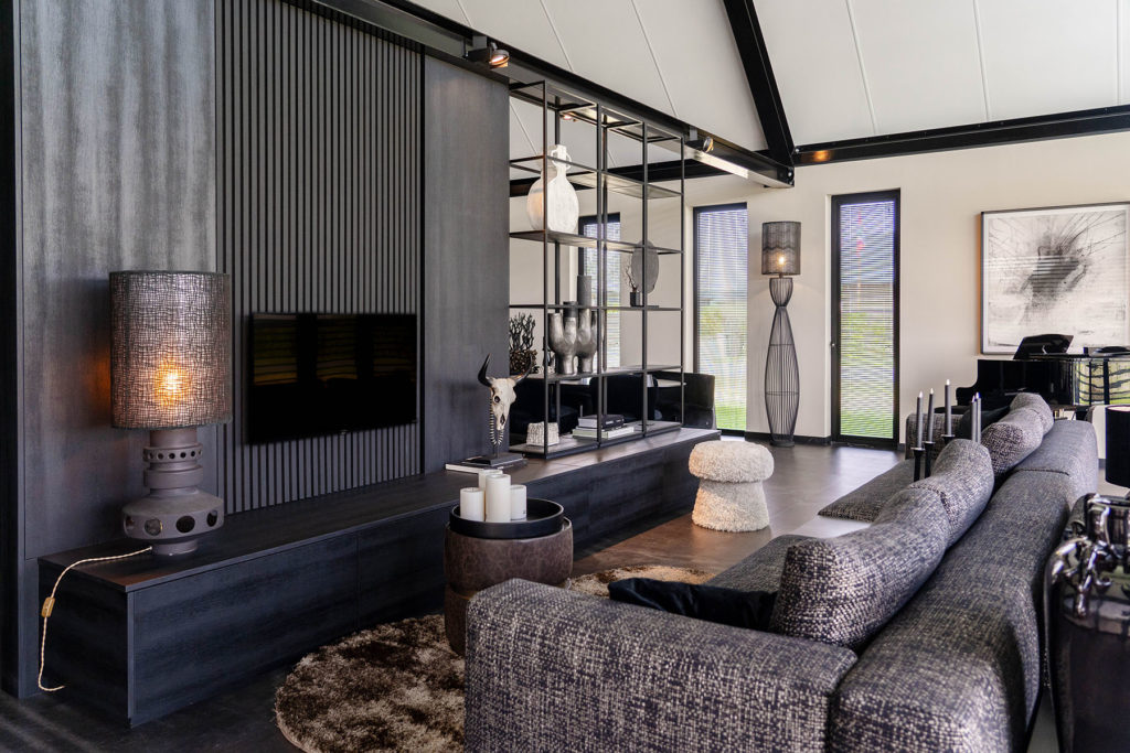 Deze indrukwekkende villa ademt het gevoel van een luxe boutiquehotel, midden in het groen. De hoge kap, de donkere ranke lijnen en de royale glaspartijen geven het interieur een elegante grandeur. Binnen vormt maatwerk de rode draad. Van de rijke wandbekleding in de slaapkamers tot de verfijnde materialen in de badkamer met marmeraccenten: iedere ruimte voelt warm, intiem en tegelijk uitgesproken modern. Het zachte licht, zorgvuldig geplaatste designverlichting en de rustige kleurbasis zorgen voor een sfeer waarin je direct ontspant.